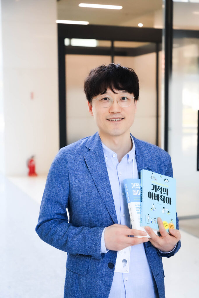 A. 책을 쓰게 된 데에는 아내의 역할이 컸어요. 저는 연구원이고 공대 출신이라 책을 쓴다는 건 생각도 못 했어요. 그런데 아내가 ‘당신의 육아 경험과 노하우가 초보 아빠에게 큰 도움이 될 거야’ 라고 말해준 게 책을 쓰게 된 결정적인 계기가 됐어요. 아이들과 시간을 보낼 때마다 ‘어떻게 하면 짧은 시간이라도 더 밀도 있게 보내고 추억할 수 있을까’를 고민했는데요. 이런 제 모습을 보고 아내는 저의 육아 경험과 노하우가 초보 아빠들에게 많은 도움이 될 수 있다고 격려해 줬어요. 그 한마디에 용기를 얻어 진짜로 글을 쓰기 시작했고 지금은 육아서적 두 권을 집필한 아빠 작가가 되었어요. 첫 번째 책에서는 놀이, 독서, 영어, 대화법 등 육아 관련 전반의 내용을 다뤘고 두 번째 책에서는 놀이법을 담았어요. 이 외에 초보 아버님들에게 저의 경험과 노하우를 나누는 육아 칼럼도 쓰고 있고요.