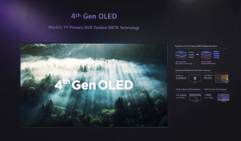 궁극의 Natural Reality 화질 구현을 위해 LG디스플레이의 OLED 기술은 빠르게 진화되고 있는데요. LG디스플레이의 4세대 OLED는 RGB 소자를 독립적으로 쌓아 빛을 내는 프라이머리 RGB 탠덤 기술을 적용해 프리미엄 디스플레이의 기준을 한층 끌어올렸습니다. 업계 최고 수준인 최대 휘도(밝기) 4,000니트 (nit, 1니트는 촛불 한 개의 밝기) 와 완벽에 가까운 색 재현율을 바탕으로 더욱 밝고 생생한 디테일을 표현할 뿐 아니라 초저반사 기술을 통해 반사율을 개선하여 암실이나 명실 등 어떠한 환경에서도 완벽한 블랙을 구현합니다. 이를 통해 LG디스플레이는 극강의 화질을 제공하는 대형 OLED 기술의 새로운 지평을 열고 있습니다.