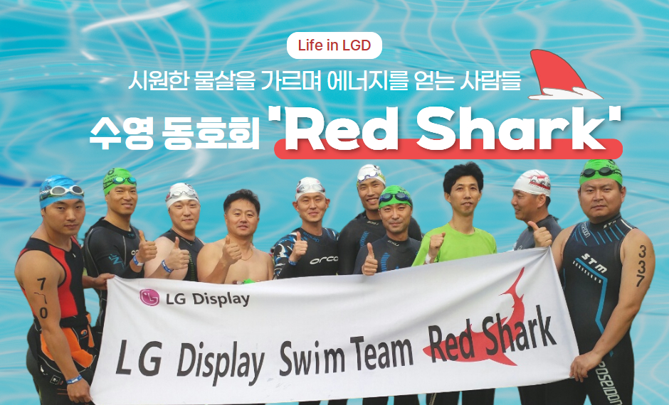 LG디스플레이 수영 동호회 ‘Red Shark’는 수영을 통해 건강을 챙기고 나눔을 실천하는 열정적인 모임입니다. 초급자부터 상급자까지 다양한 구성원이 함께하며 정기 훈련은 물론 수영 대회와 철인 3종 경기에도 도전하고 있습니다.