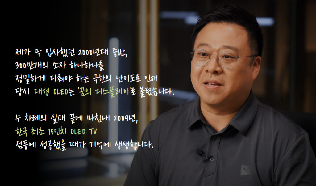 그럼에도 LG디스플레이의 도전은 계속됐습니다. “세상에 없던 걸 만들고 싶다”는 구성원들의 열정이 있었기 때문이죠. 또한 각 분야에서의 전문가들이 적재적소로 배치가 되어 시너지를 냈고, OLED의 대형화가 LG디스플레이의 미래 성장 동력이 될 것이라는 확신을 가지고 끈질기게 연구했습니다. 이러한 노력 끝에 2009년, 우여곡절 끝에 마침내 LG디스플레이는 한국 최초 15인치 OLED TV 패널 개발에 성공했습니다.