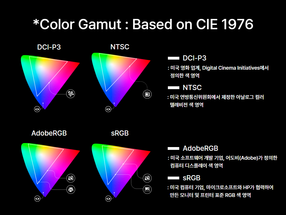 디스플레이가 표현할 수 있는 색의 폭은 색역(Color Gamut)이라고 하며, 이 범위가 넓을수록 콘텐츠의 원래 색을 더 정확하게 표현할 수 있는데요.