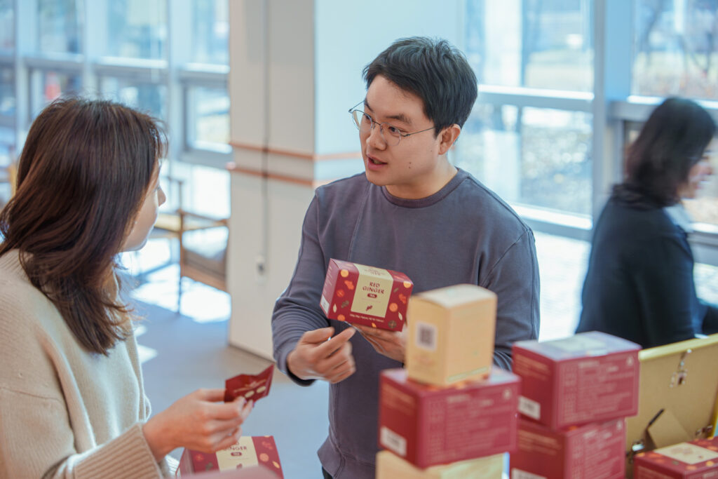 점심 시간, LG디스플레이 파주 사업장 휴게공간이 하나, 둘 밀려오는 구성원들의 발길로 붐빈다. 밝은 조명 아래 정갈하게 꾸려진 매대 위로 다양한 제품과 대화가 오고가는 모습이 회사에서는 보이는 풍경이라기엔 색다른 느낌이다. “이 제품은 줄 서서 팔리는 제품이에요.”, “할인하고 있으니 편하게 둘러보세요.” 직원들의 친근한 안내와 구성원들의 웃음 사이로 업무 속 잠시 쉬어가는 듯한 편안함이 퍼진다.