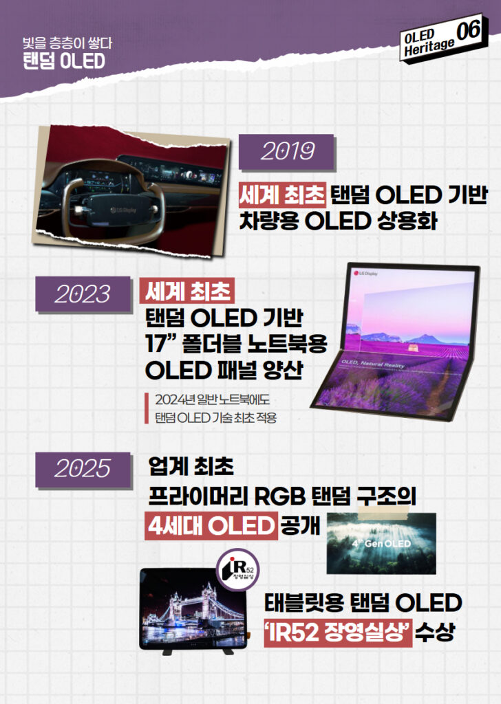 LG디스플레이의 탠덤 OLED 기술은 지난 몇 년간 진화를 거듭하며 다양한 제품군으로 확장됐다. 2019년 차량용 OLED 상용화를 시작으로 2023년에는 세계 최초로 탠덤 구조가 적용된 17인치 폴더블 노트북용 OLED가 양산됐다. 이어 2024년에는 일반 노트북까지 적용 범위가 확대됐고, 2025년에는 두 개의 청색 소자층과 각각 독립된 적색, 녹색 소자층을 더해 총 4개층으로 광원을 구성한 ‘프라이머리 RGB 탠덤 구조’의 4세대 OLED가 공개되며 기술 완성도가 한 층 높아졌다. 같은 해 태블릿용 탠덤 OLED가 IR52 장영실상을 수상하며 세계 최고 수준의 기술력을 인정받기도 했다.