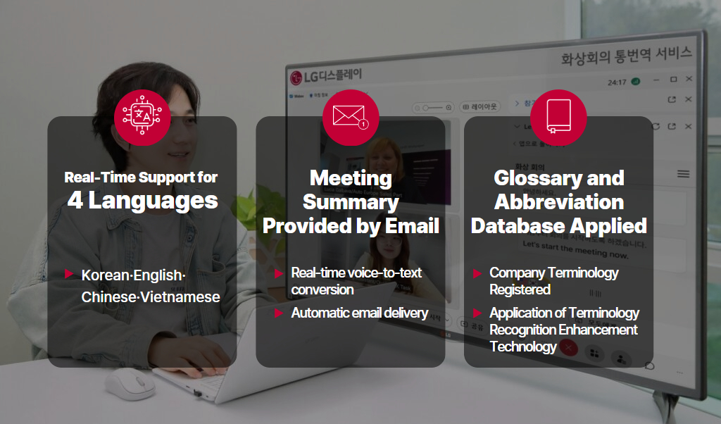 In today’s global business world, language plays a key role in the speed and quality of communication. With customers, subsidiaries, and partners located across the globe, LG Display frequently holds video meetings in multiple languages. So, in many meetings, the use of language interpretation can lead to extended meeting durations or inadequate communication, as the content may not be effectively conveyed. However, with the AI assistant’s real-time translation feature, these conversations are becoming smoother and more efficient.