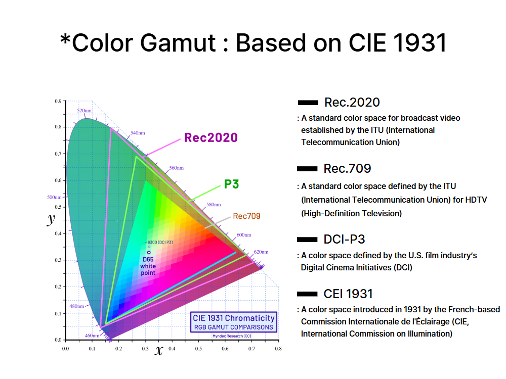 Advancements in cameras and video production technologies are continually expanding the range of colors that can be captured. Displays, in turn, must evolve to keep pace. UHD standards, for instance, are based on Rec.2020, which covers a color space about 172% wider than sRGB used for HDTV. As content production increasingly shifts toward Rec.2020 as the reference standard, audiences will encounter this wider color space across a growing variety of video content in the years ahead.