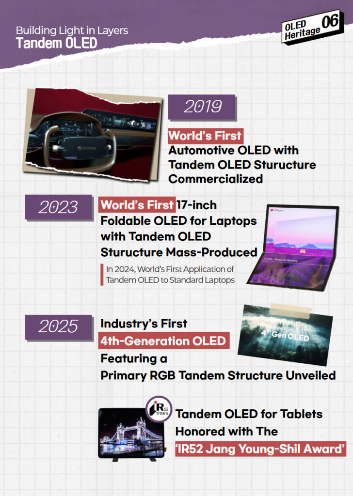 The Tandem structure, which enhances performance by vertically stacking light-emitting layers, has seen technological development in small-to medium-sized OLEDs, including automotive displays, tablets, and laptops. By optimizing the Tandem structure for diverse use environments, LG Display has continued to expand the scope of OLED innovation and elevate performance across a wide range of applications.